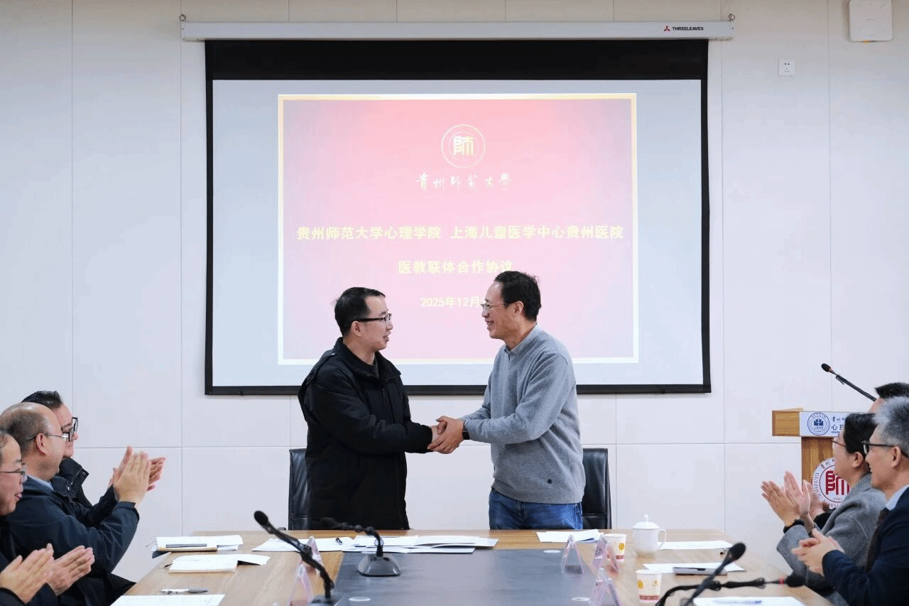 公司经理罗禹介绍了公司的学科特色、团队力量及发展成果。他指出,贵州省“十五五”规划明确提出加强心理健康和精神卫生工作,此次合作恰逢其时、意义深远。他表示,公司将以签约为契机,与上海儿童医学中心贵州医院深化交流协作,共建研究生联合培养基地,联合申报科研项目、开展学术研究,共同推进儿童心理健康科普宣传,为健康贵州建设贡献师大心理力量。