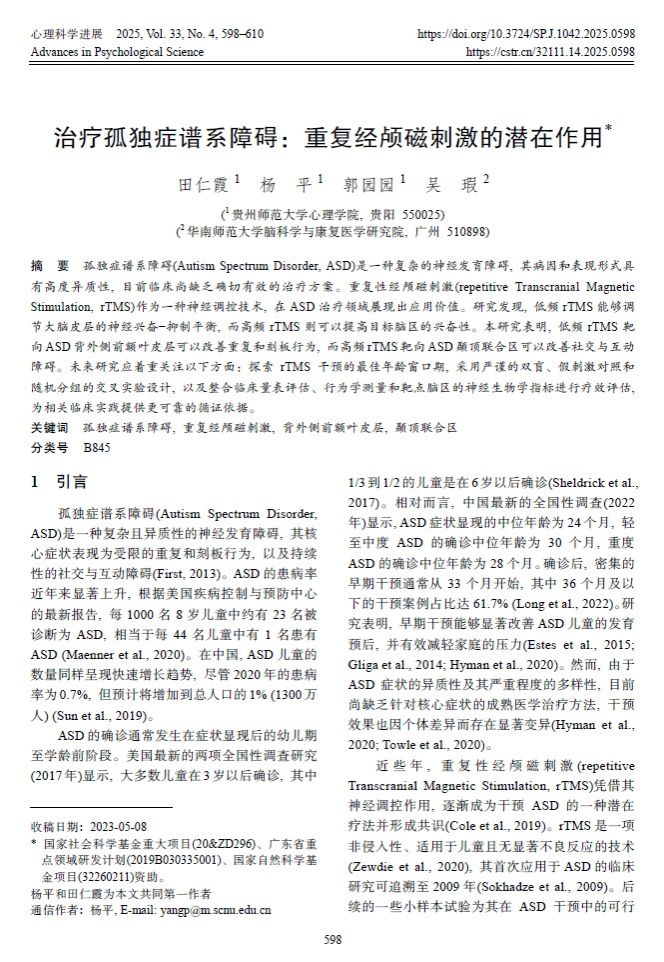 4. 研究生田仁霞作为第一作者,杨平副教授作为通讯作者,2025年3月在CSSCI期刊《心理科学进展》上发表了题为“治疗孤独症谱系障碍:重复经颅磁刺激的潜在作用”的研究论文。研究发现,低频rTMS靶向ASD背外侧前额叶皮层可以改善重复和刻板行为,而高频rTMS靶向ASD颞顶联合区可以改善社交与互动障碍。
