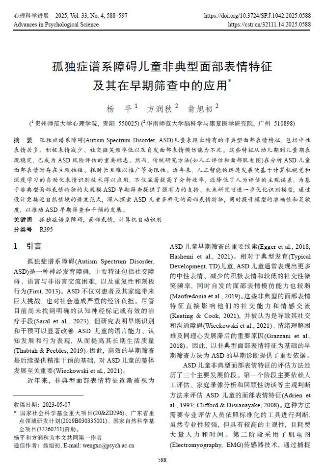 3. 杨平副教授作为第一作者,2025年3月在CSSCI期刊《心理科学进展》上发表了题为“孤独症谱系障碍儿童非典型面部表情特征及其在早期筛查中的应用”的研究论文。研究围绕ASD儿童的非典型面部表情特征进行了系统回顾。