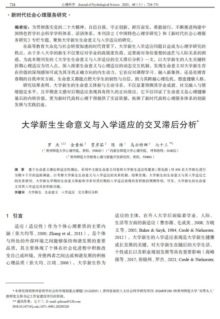 1. 罗杰教授作为第一作者,2025年5月在CSSCI期刊《心理科学》上发表了题为“大学新生生命意义与入学适应的交叉滞后分析”的研究论文。研究发现,大学新生的生命意义与其入学适应之间关系密切,大学新生早期的生命意义体验和寻求对其后期的入学适应表现具有积极的预测作用。