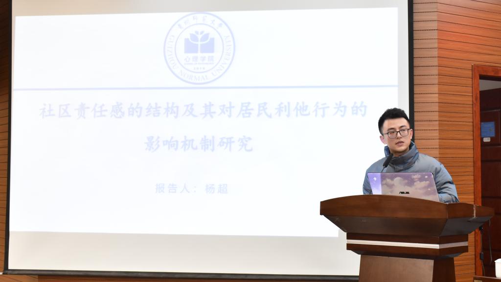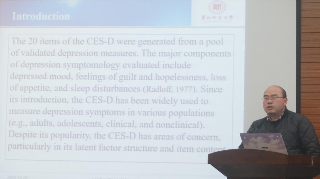 学术交流环节阶段,主要以“‘十四五’时期贵州省社会心理服务体系完善与提升”为主题展开交流研讨。美加墨世界杯官方网站罗杰老师、杨超老师分别作了《Factor structure of the Center for Epidemiological Studies Depression Scale (CES-D):An exploratory structural equation modeling》和《社区责任感的结构及其对居民利他行为的影响机制研究》的主题报告。