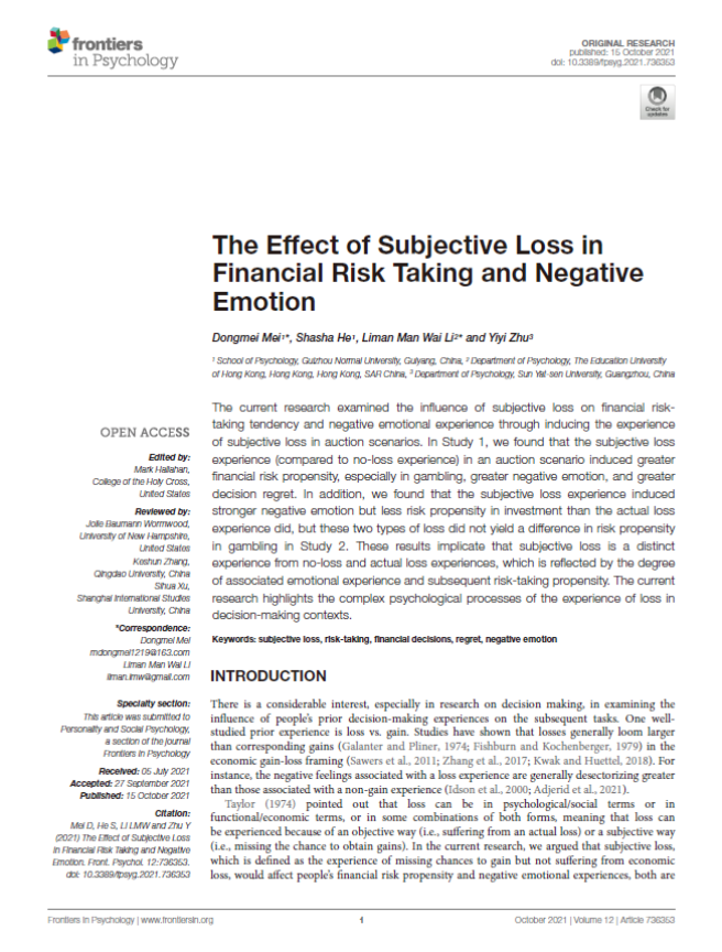 6.梅冬梅博士作为第一作者,2021年10月在SSCI JCR二区期刊《Frontiers in Psychology》发表了题为“The Effect of Subjective Loss in Financial Risk Taking and Negative Emotion”的学术论文。