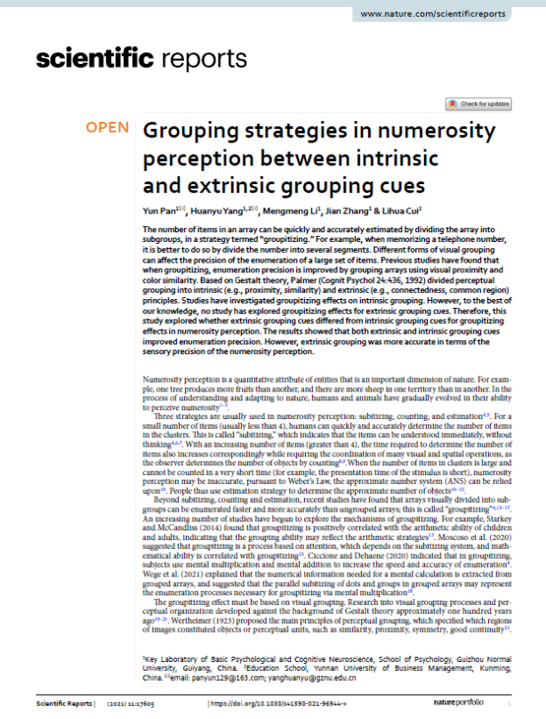 1.潘运教授作为第一作者,2021年9月在SCI JCR一区期刊《Scientific Reports》发表了题为“Grouping strategies in numerosity perception between intrinsic and extrinsic grouping cues”的学术论文。