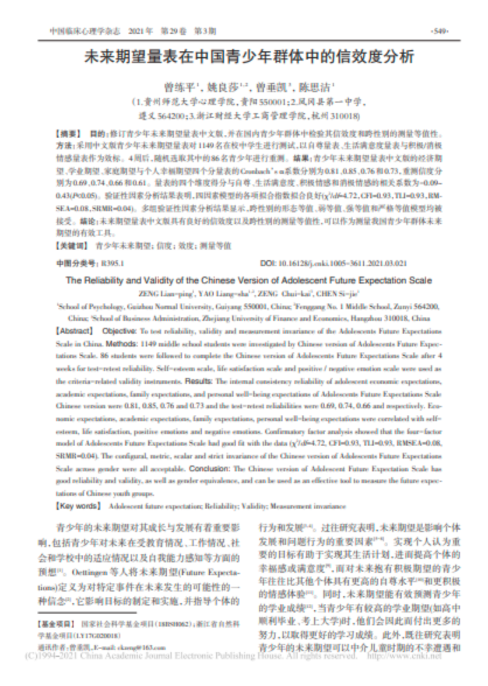 9.曾练平副教授作为第一作者,2021年6月在CSSCI期刊《中国临床心理学杂志》发表了题为“未来期望量表在中国青少年群体中的信效度分析”的学术论文。