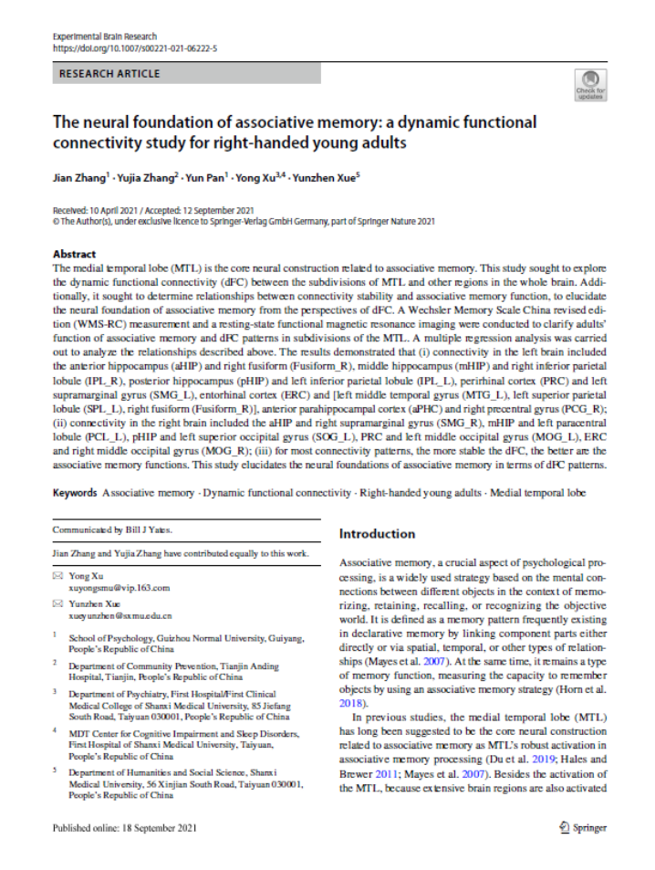 8.潘运教授作为通讯作者,2021年9月在SCI JCR四区期刊《Experimental Brain Research》发表了题为“The neural foundation of associative memory: a dynamic functional connectivity study for right‑handed young adults”的学术论文。