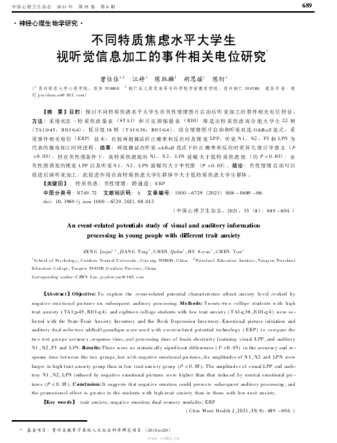12.陈衍副教授作为通讯作者,2021年7月在CSCD期刊《中国心理卫生杂志》发表了题为“不同特质焦虑水平老员工视听觉信息加工的事件相关电位研究”的学术论文。