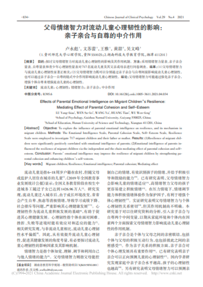 10.卢永彪副教授作为第一作者,2021年8月在CSSCI期刊《中国临床心理学杂志》发表了题为“父母情绪智力对流动儿童心理韧性的影响:亲子亲合与自尊的中介作用”的学术论文。