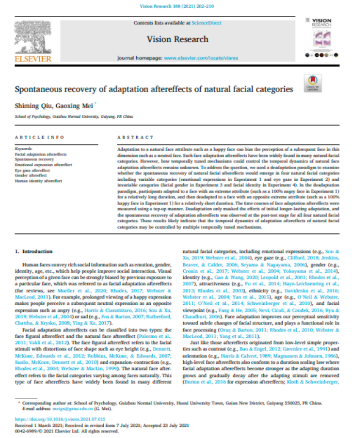 7. 2018级硕士研究生仇式明为第一作者、梅高兴副教授为通讯作者在SCIJCR三区期刊《Vision Research》发表了题名为“Spontaneous recovery of adaptation aftereffects of natural facial categories”的研究论文。