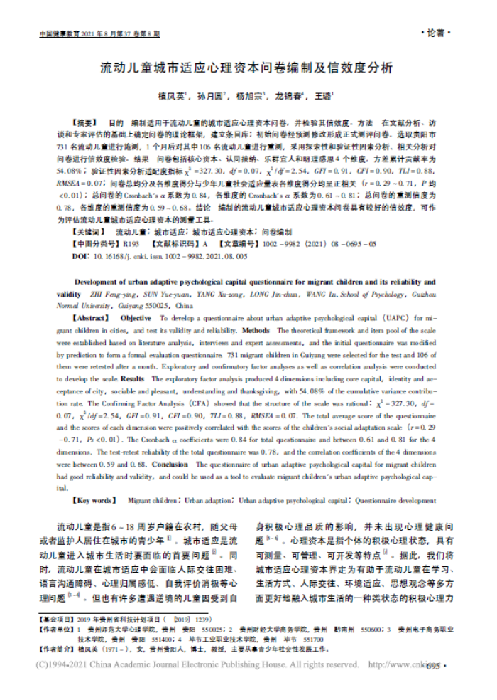 15.植凤英教授作为第一作者,2021年8月在北大核心期刊《中国健康教育》发表了题为“流动儿童城市适应心理资本问卷编制及信效度分析”的学术论文。