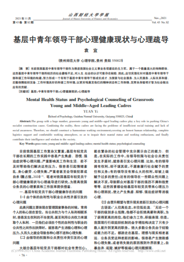 11.袁宜教授作为第一作者,2021年8月在CSSCI期刊《山西财经大学学报》发表了题为“基层中青年领导干部心理健康现状与心理疏导”的学术论文。