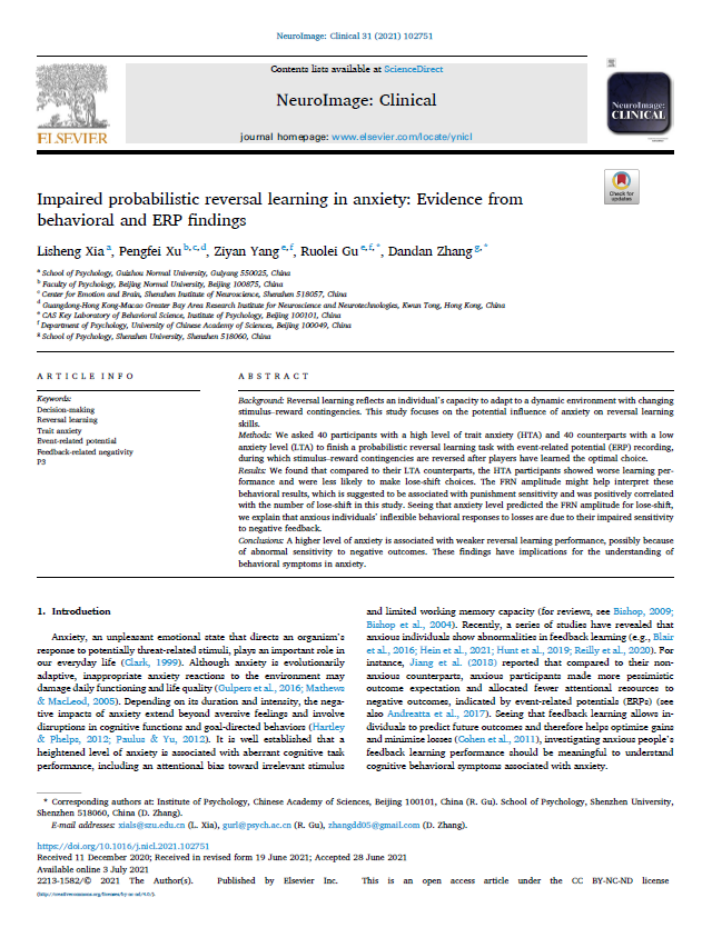 5.夏礼胜博士作为第一作者,2021年7月在SCI JCR二区Top期刊《NeuroImage: Clinical》发表了题为“Impaired probabilistic reversal learning in anxiety: Evidence from behavioral and ERP findings”的学术论文。