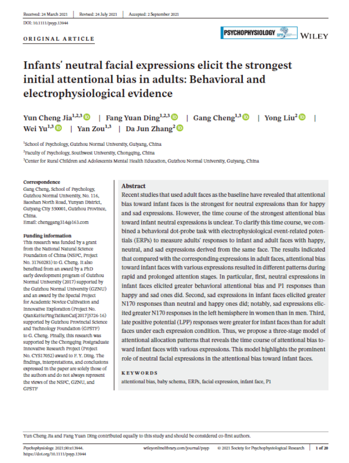 4.程刚老师作为通讯作者,2021年9月在SCI JCR一区期刊《Psychophysiology》发表了题为“Infants’ neutral facial expressions elicit the strongest initial attentional bias in adults: Behavioral and electrophysiological evidence”的学术论文。
