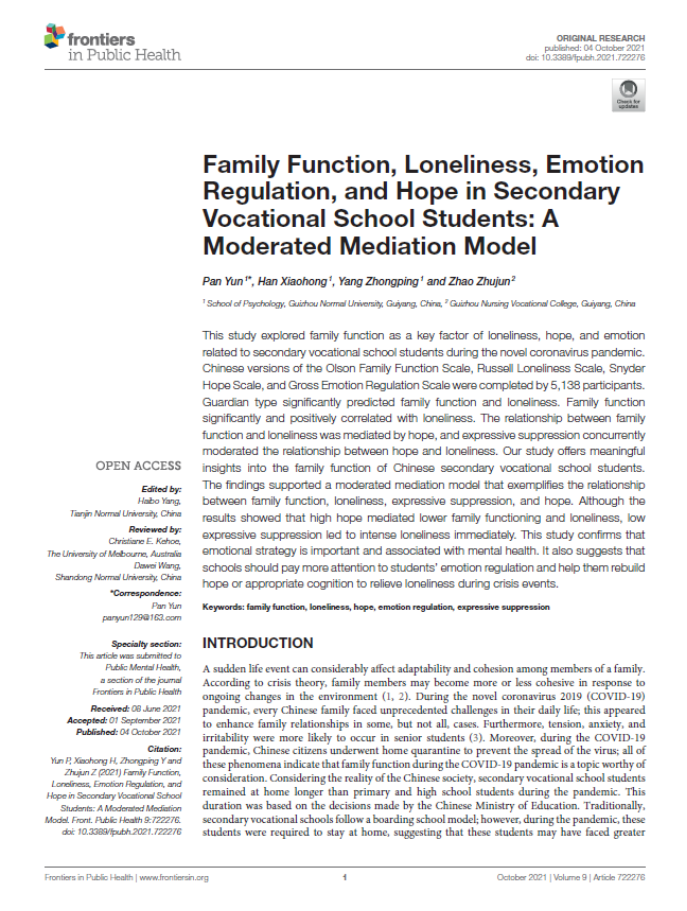 2.潘运教授作为第一作者,2021年10月在SCI JCR一区期刊《Frontiers in Public Health》发表了题为“Family Function, Loneliness, Emotion Regulation, and Hope in Secondary Vocational School Students: A Moderated Mediation Model”的学术论文。