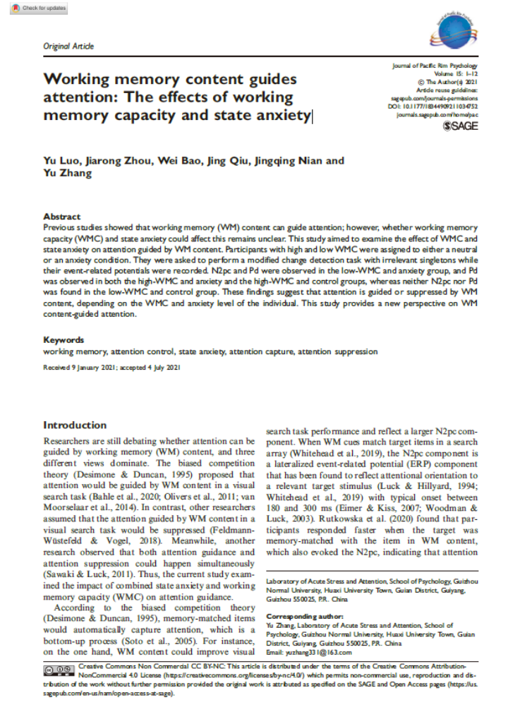 3.罗禹副教授作为第一作者,2021年7月在SSCI JCR三区期刊《Journal of Pacific Rim Psychology》发表了题为“Working memory content guides attention: The effects of working memory capacity and state anxiety”的学术论文。