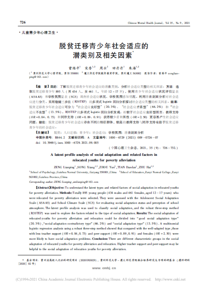 14.曾练平副教授作为第一作者,2021年9月在CSCD期刊《中国心理卫生杂志》发表了题为“脱贫迁移青少年社会适应的潜类别及相关因素”的学术论文。