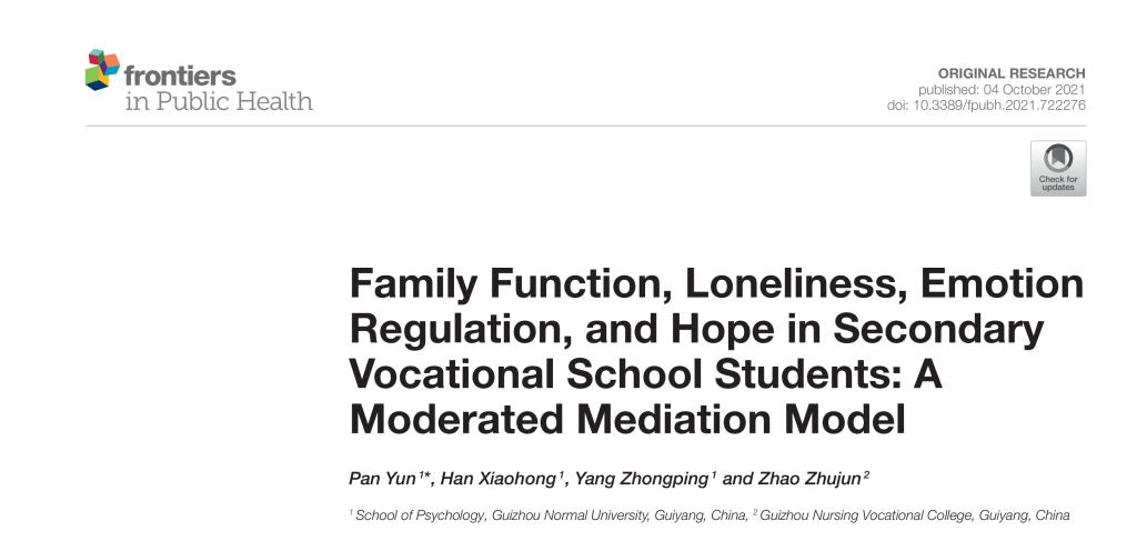 近日,公司潘运教授等人在SSCI 1区期刊Frontiers in Public Health(IF=3.709)在线发表题为“Family Function, Loneliness, Emotion Regulation, and Hope in Secondary Vocational School Students: A Moderated Mediation Model”的研究论文。