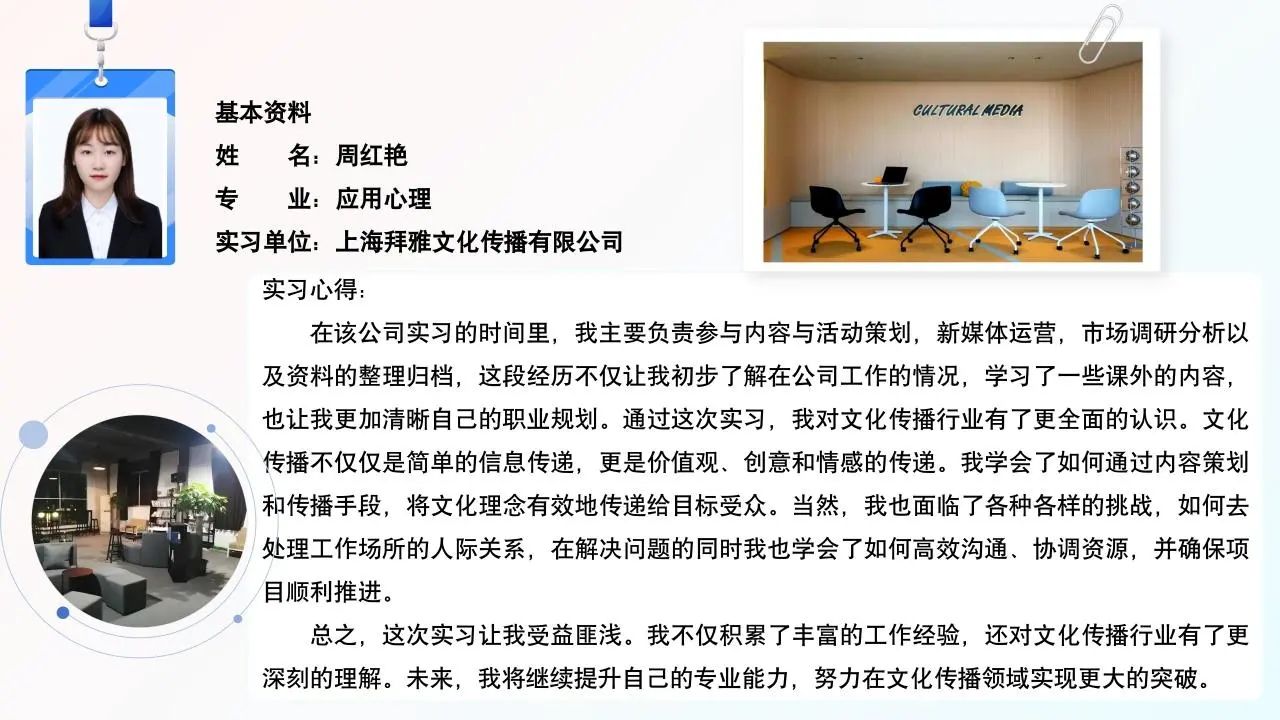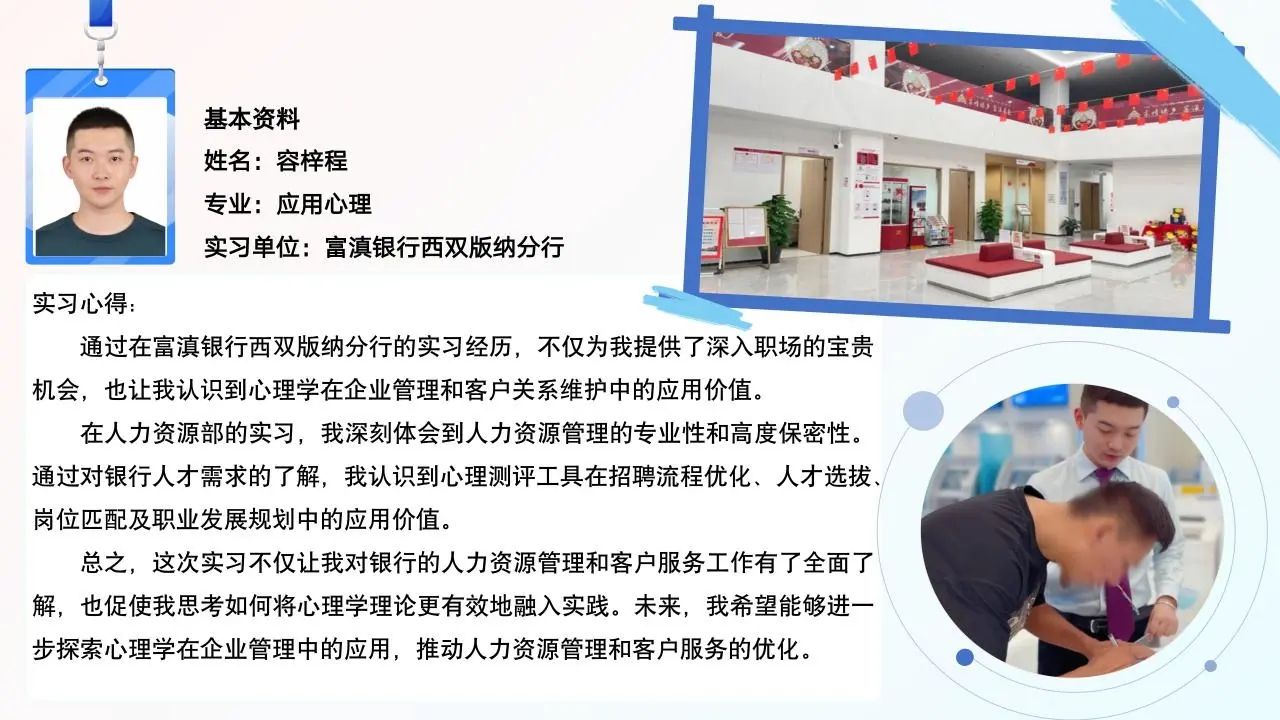 “我的职场初体验”系列主题党日活动的成功举办,不仅强化了支部党员的党性修养,提高了党员的实践能力,也为支部主题党日活动的组织形式提供了新思路,真正做到让党徽在实习一线闪耀光彩,让青年党员在实践中锤炼党性,在青春奋斗中书写成长!