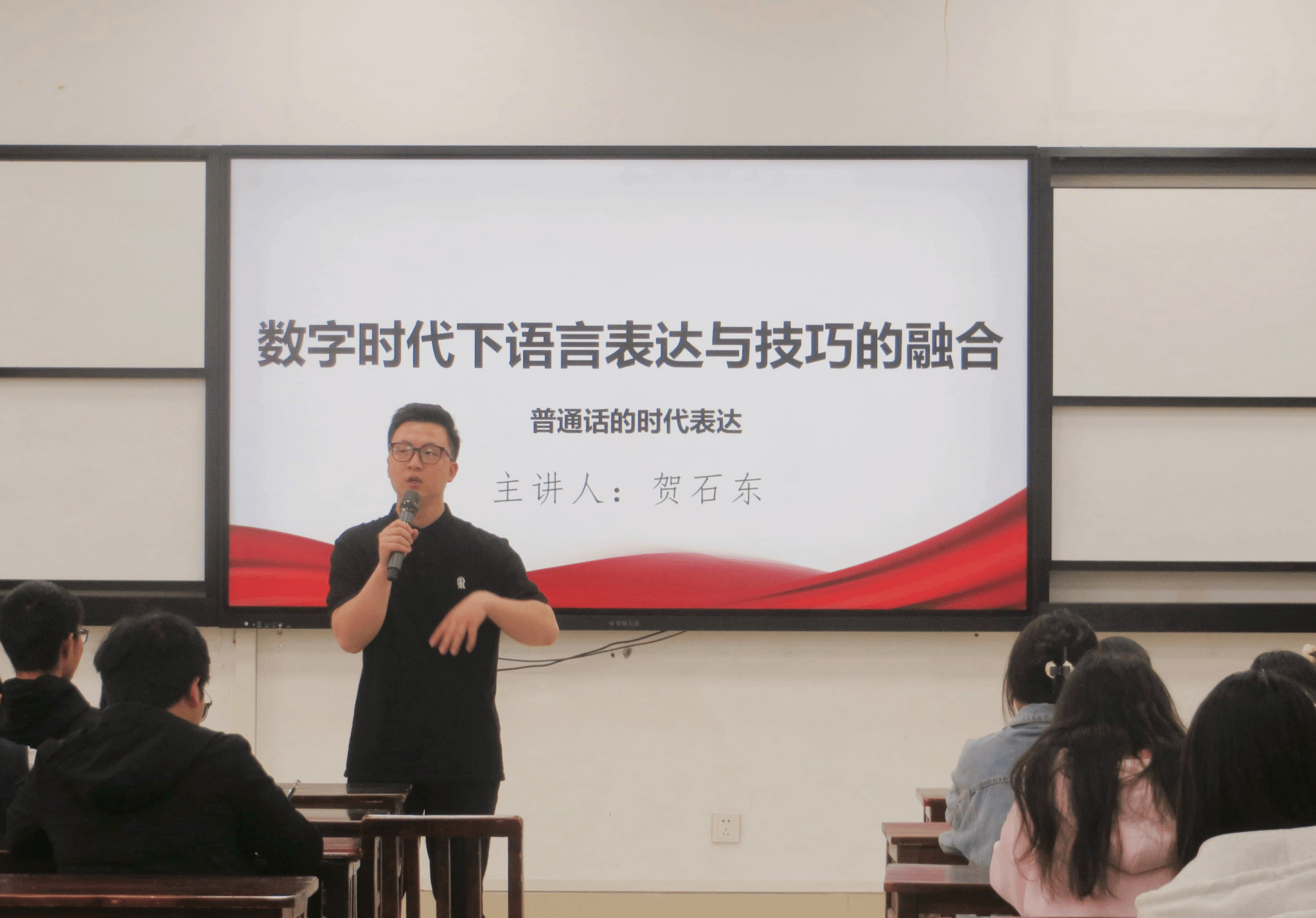 4月23日,贺石东老师在公教3211教室,围绕“数字时代下的语言表达艺术”主题,为员工带来一场别开生面的普通话培训。上午的课程中,贺老师紧扣融媒体时代特征,深入剖析文化融合与多元表达的实践路径,结合人工智能语言应用场景与脱口秀表达技巧,生动阐释普通话的时代内涵;下午的实践环节,贺老师针对员工普遍存在的“平翘舌音混淆”“声调把握不准”等问题,通过示范朗读、一对一指导,帮助员工精准提升语言表达的规范性与感染力。