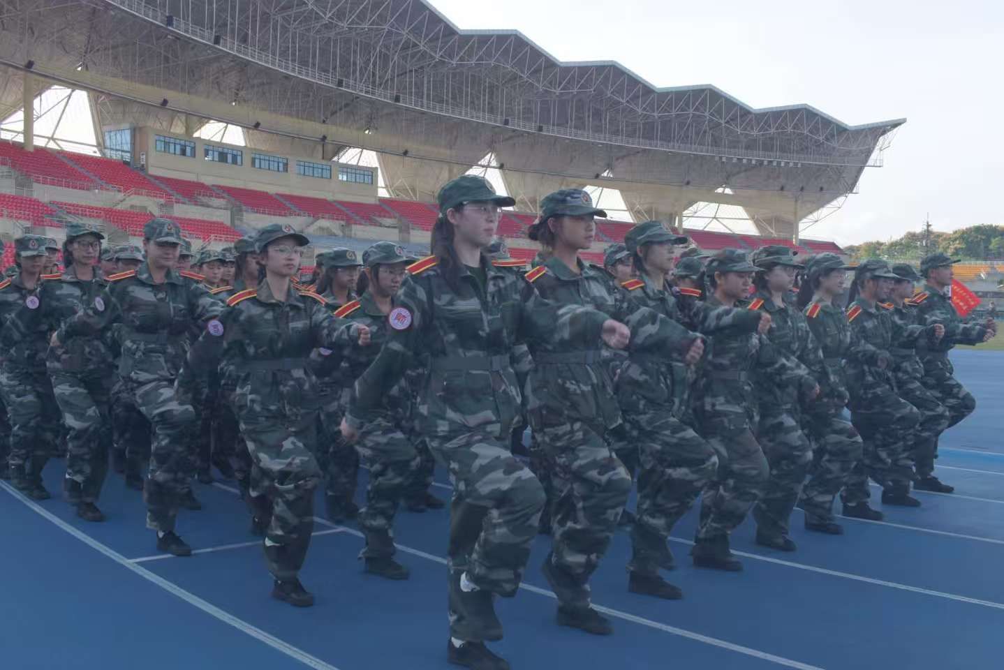 每一次抬手,都要让小臂与地面呈精准的30度夹角,指尖绷直如裁;每一次摆臂,都要擦过裤缝划出利落弧线;每一次“一二三四!”的呐喊,更是冲破胸腔,把奋进的力量砸在训练场的每一寸土地上!