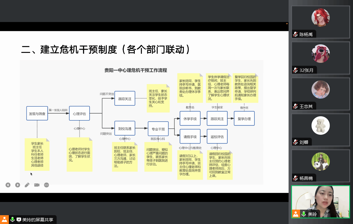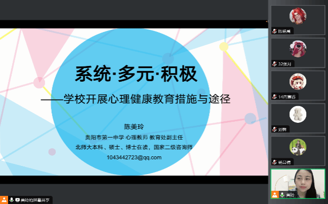 首先陈美玲老师通过心理辅导、危机干预制度两方面着重讲解了在开展心理健康教育的过程。首先是介绍了贵阳一中的心理辅导中心的建设,让我们对其有更多的了解。然后给我们讲解咨询的注意事项以及最重要的就是同员工建立良好的咨询关系,并且需要掌握各种相关的专业知识。最后每次都对自己咨询进行工作记录。