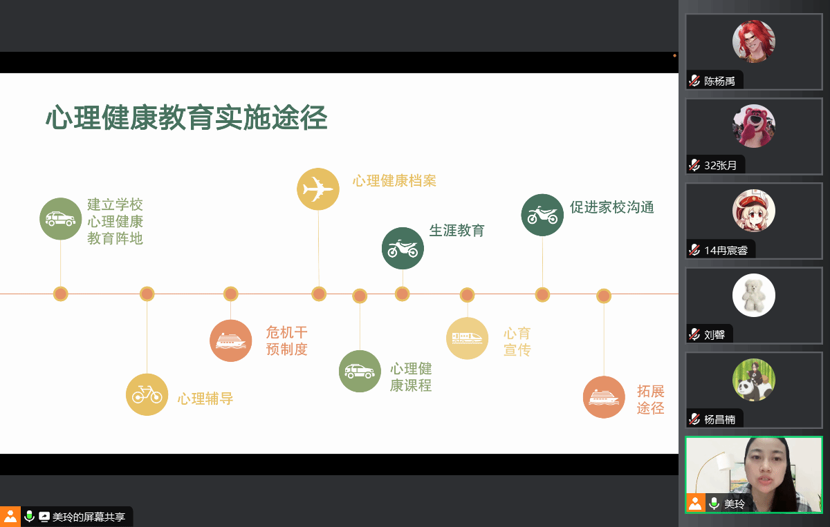 本次会议主要内容是陈美玲老师向同学们讲解心理健康教育的途径是如何进行,以及在实施的过程中应该注意哪些方面。陈美玲老师主要通过建立公司心理健康教育阵地、心理辅导、危机干预制度、心理健康档案、心理健康课程、生涯教育、心育宣传、促进家校沟通、拓展途径多个方面来让我们了解心理健康教育的实施途径。