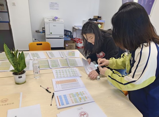 李露露和张奋勤协助李老师完成高三年级周测成绩数据分析表,根据不同的班级将其装订成册。数据一目了然,能准确分析各班的教学进度和具体成绩情况。