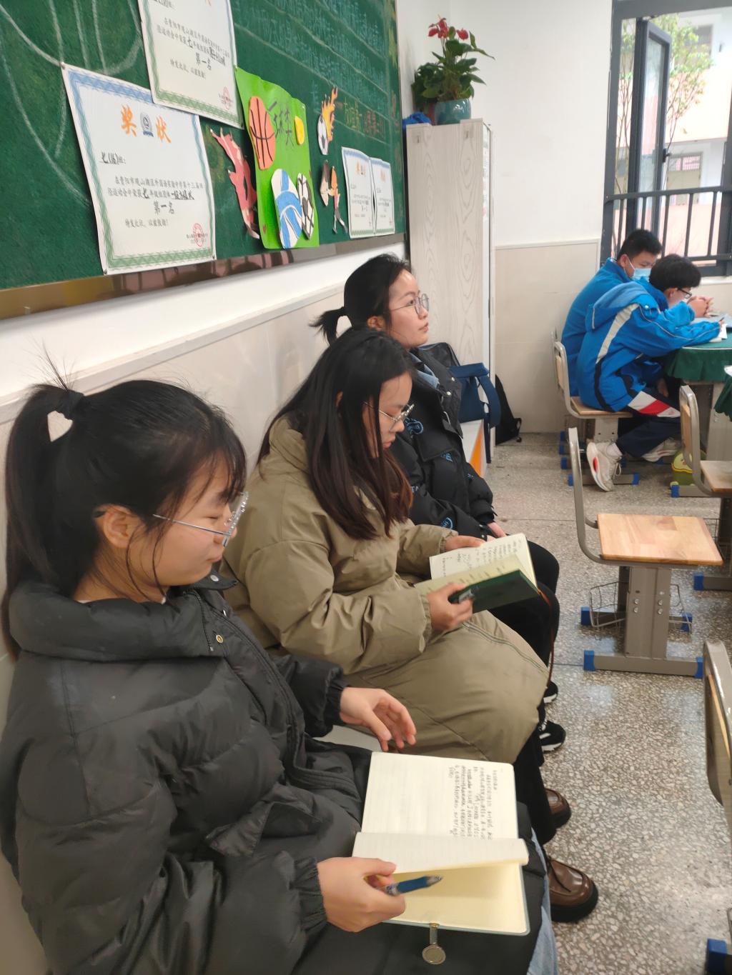 四位同学分别根据自己班主任的安排和指导进行相关的班主任工作。如课间操组织各自班级的同学排队下楼,下午监督各班班级打扫卫生等。其中,在九三班进行实习班主任工作的张玲,在班主任田老师出差后,认真管理班级,和员工家长及时进行沟通;在七(17)班的杨雯写了特色班级建设的方案,并且逐步进行了实施。