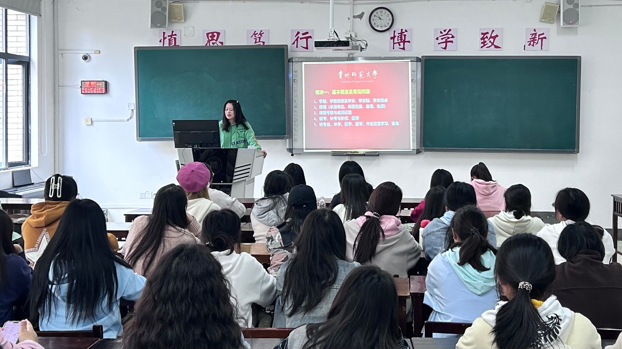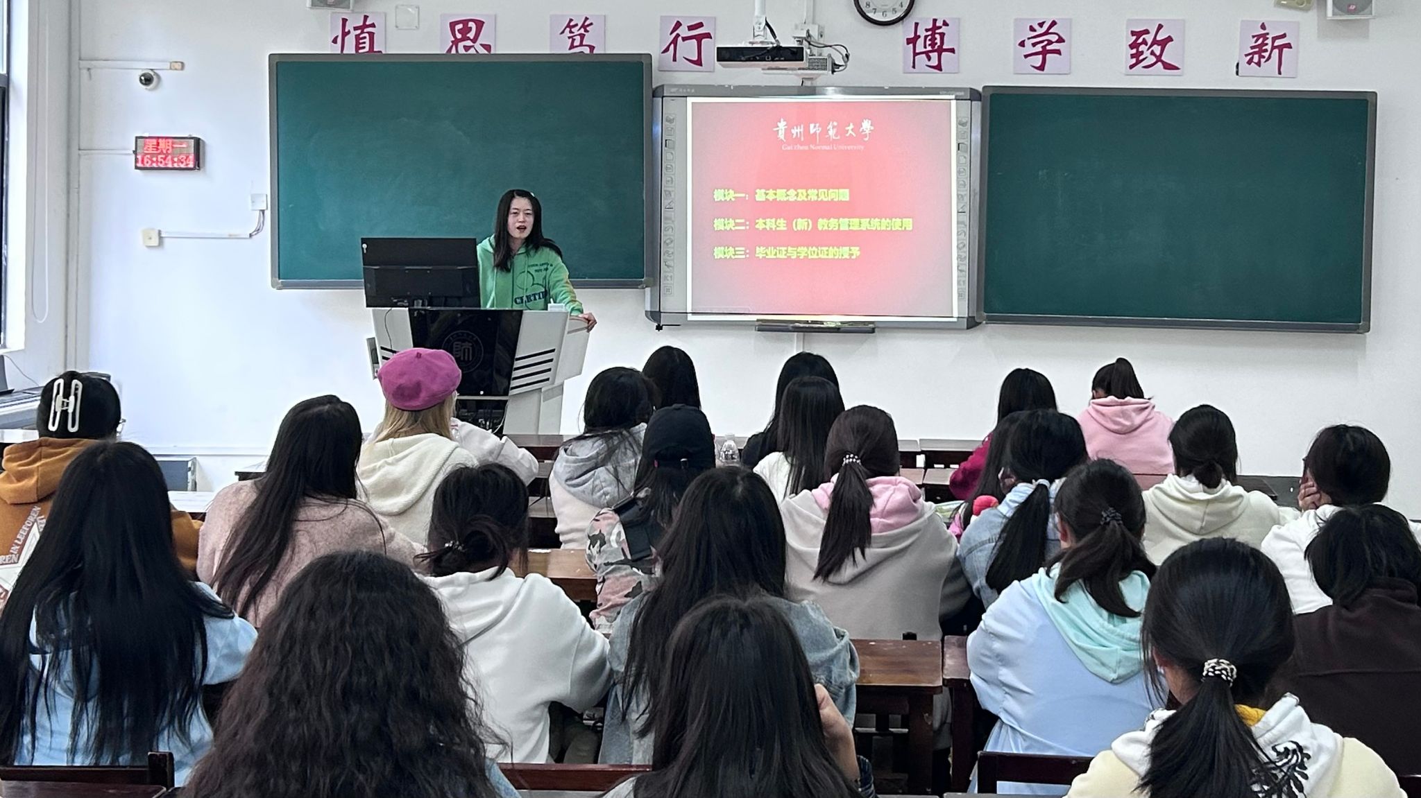 首先,盖老师向同学们解释了何为学制,学年,学分,并结合相关实例,帮助新生们更清晰的了解,关于教材、学分绩点、缓考补考等多方面常见的问题及应对方法。其次,盖老师介绍了关于教务系统中成绩查询,如何选课及如何查看选课等多个功能的使用方法。最后,盖老师向新生们介绍了毕业证及学位证的授予,即学识学位授予条件,学士学位补充授予条件,学士学位破格授予条件等。