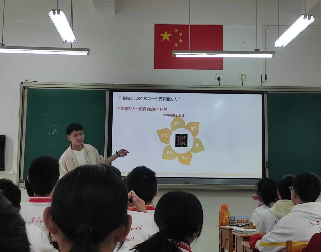 小组成员在指导老师的安排下,经过多次的修改,完成教学设计,终于要正式来到上课的环节。本周小组内有三位同学全部完成“第一堂课”:周一杨改上午上高一(2)班,主题为:正确认识自我;同时间,韦兴仗上高一(8)班主题为:我心换你心——人际交往;周四上午马德辰初二(2)班,主题为:飞上天空的气球——焦虑。全过程都有指导老师在旁听,课后老师指出小组成员上课的优缺点,并给出了诸多意见,在课余之下,小组成也自行进行了小组的讨论。小组成员的工作态度、工作完成情况得到指导教师的肯定。