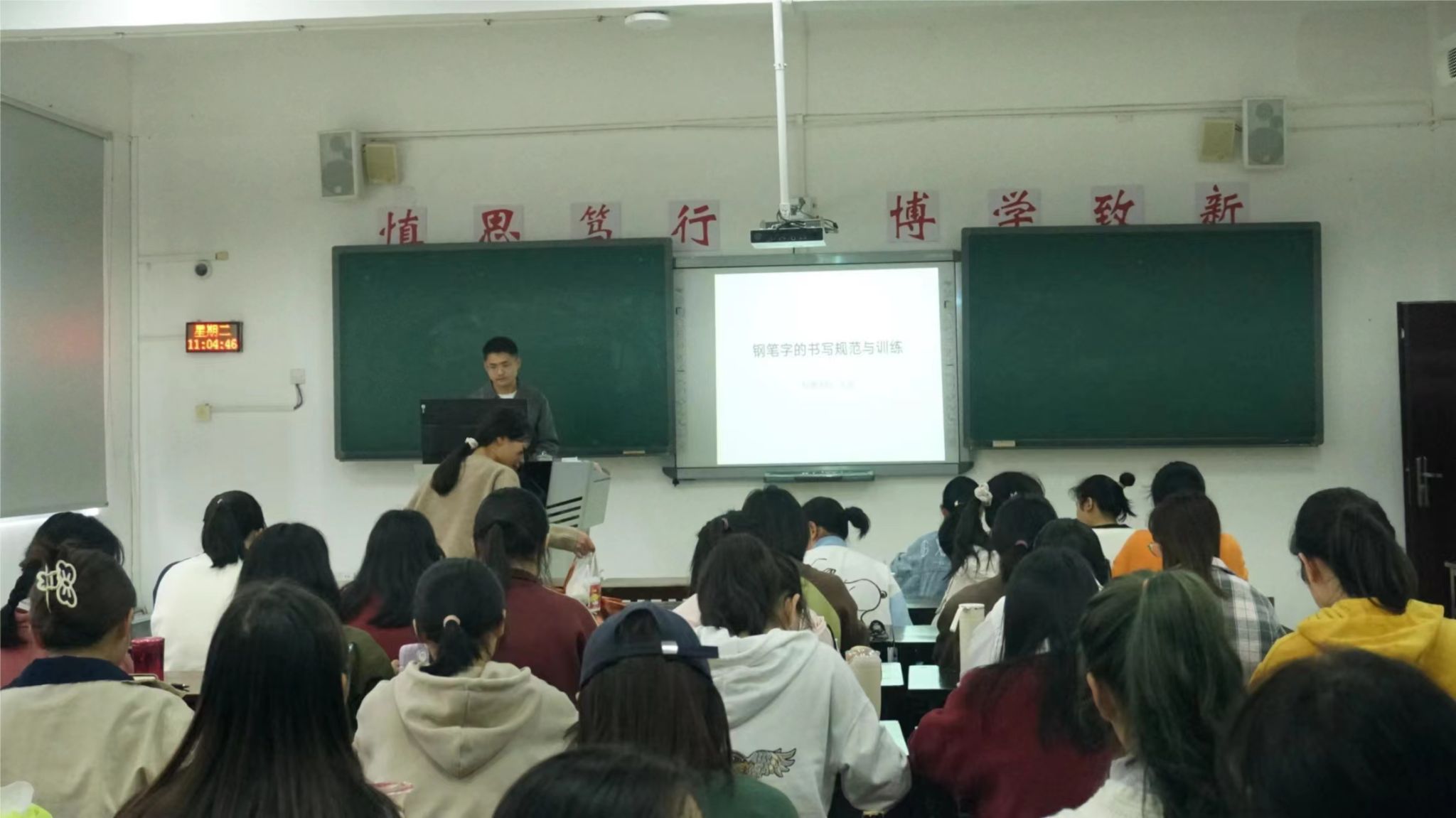 与此同时,王旭首先对钢笔字的起源、执笔、坐姿、整体布局等进行详细地讲解和示范。随后为2022级员工依次讲解了长条形、扁形、倒梯形、长方形的独体字,组织同学们分组在黑板上进行各种基础字形的练习,指导同学们从基础入手,最终达到主笔突出、空间分匀、撇捺开张的效果。