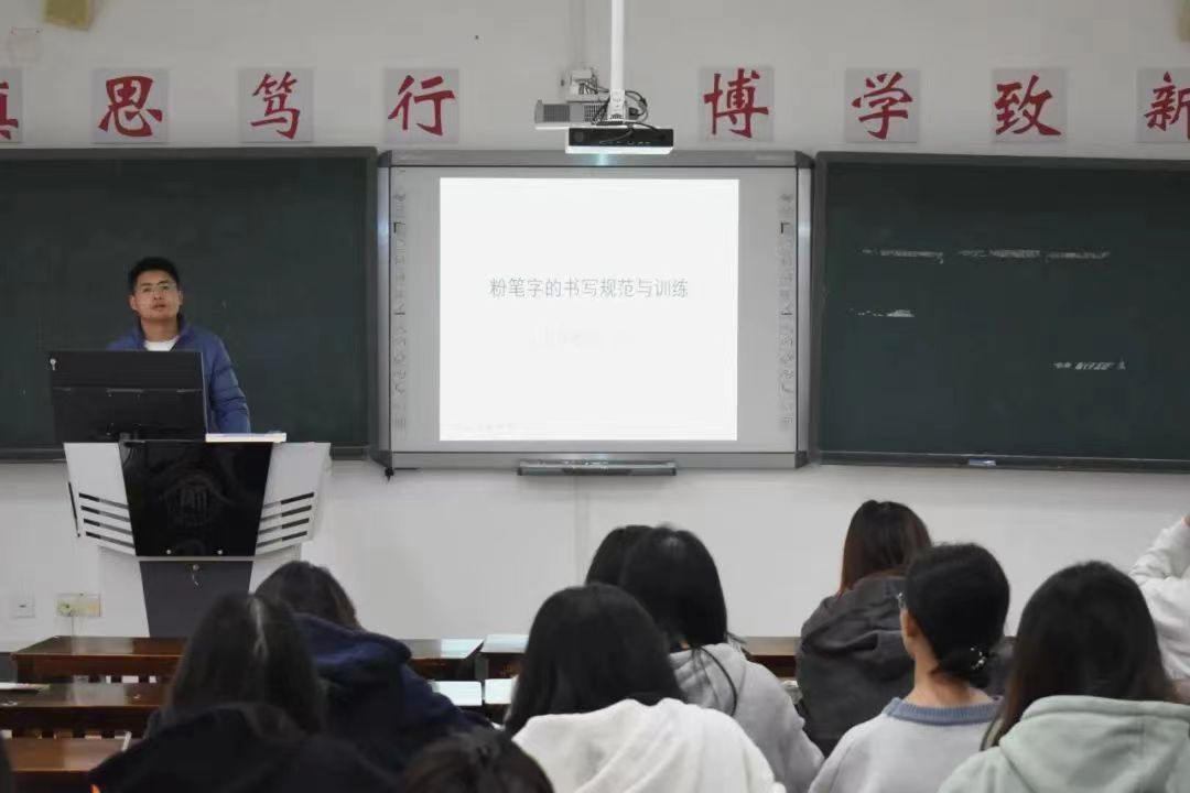 最后,王旭老师陪同大家完成了一首诗的训练,结束了本次粉笔字的培训。参训同学均表示,本次王旭老师教的粉笔字训练技巧实用有效,从中收获颇丰。