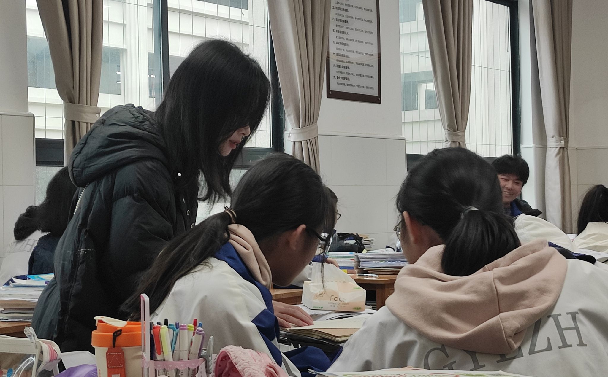 周三至周四,李小翠与杨妹李两名同学分别值守高三11班与高一4班晚自习;监督高一3班与高一4班的周考。