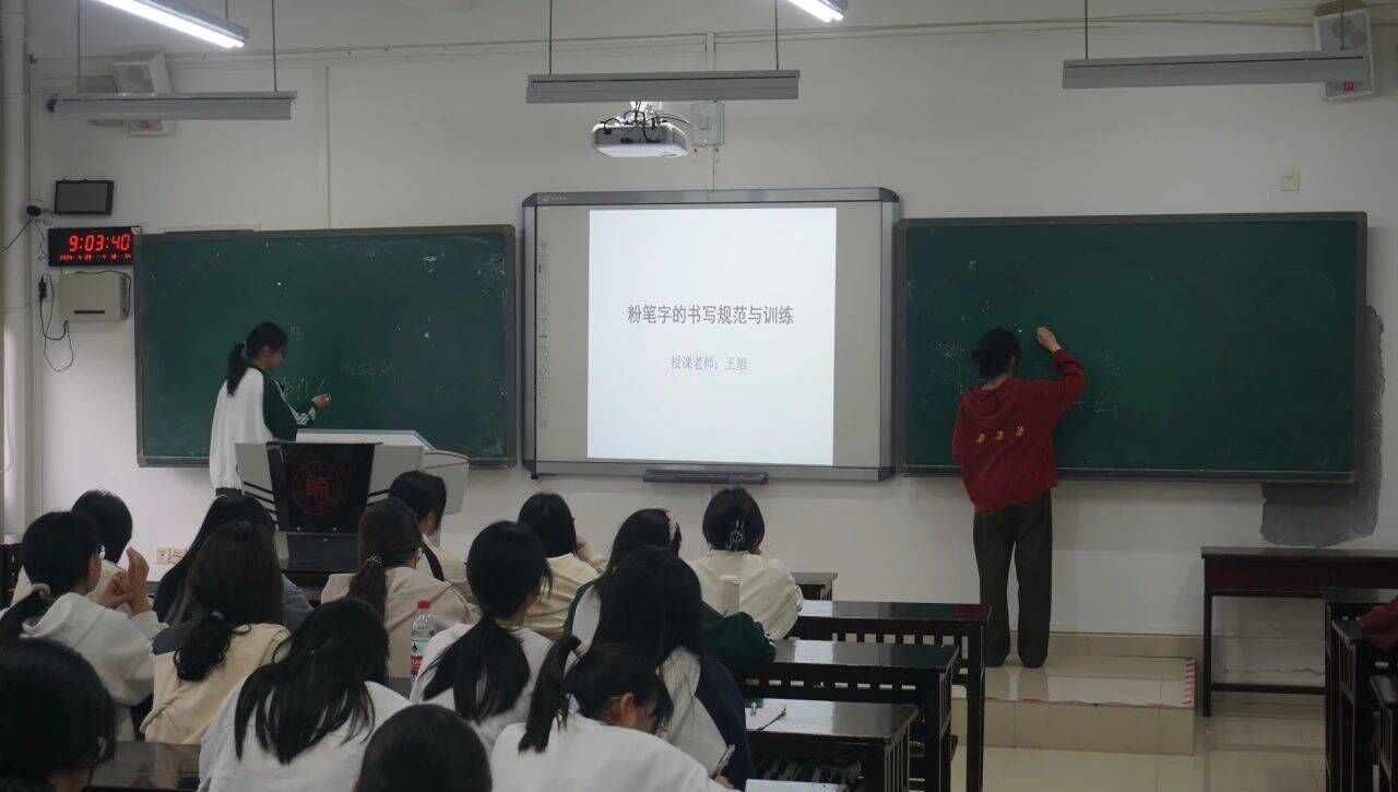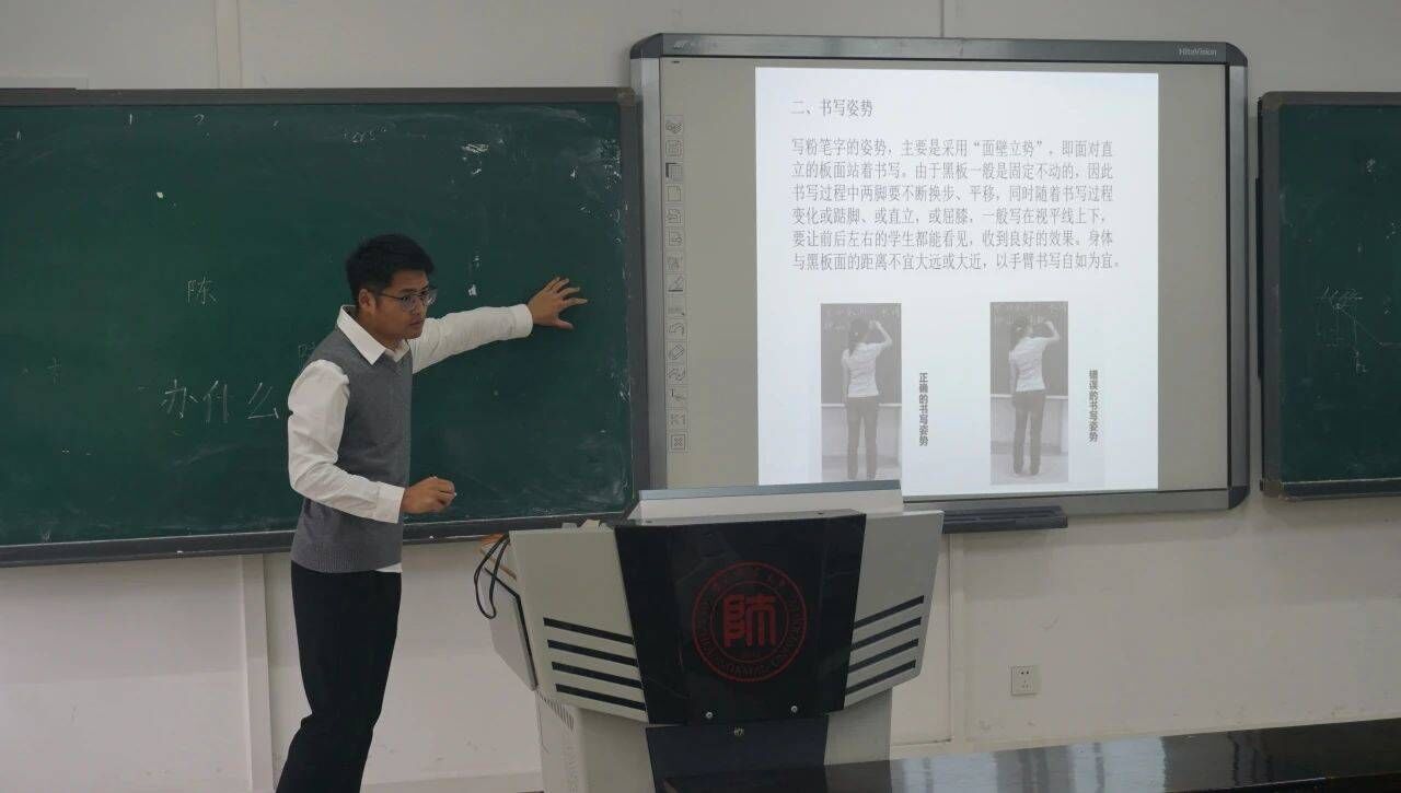 25日,王旭老师开展了粉笔字的学习与培训。王老师首先对同学们的粉笔字基础进行了解并做出纠正。接着王老师在向同学们详细介绍了握笔姿势、书写姿势、基础笔画以及字形结构的过程中,不断让同学们练习反复实践,以达到令人满意的成果。