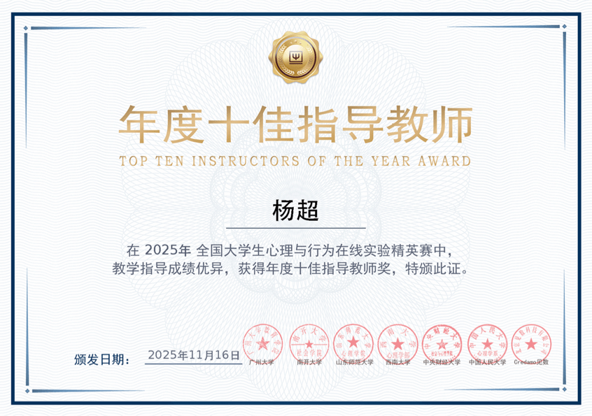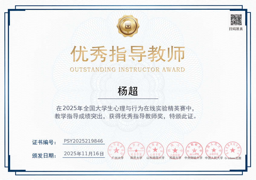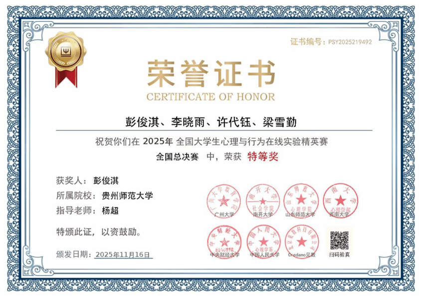 自赛事启动以来,美加墨世界杯官方网站高度重视,动员员工积极参赛,并组建了专业的评审小组对校内参赛作品进行了严格与公正的评选。其中,杨超老师指导的两支研究生团队获校级一等奖并晋级分区赛;为严格保障参赛作品评分的客观性与公平性,分区赛采取了赛区交换评审机制,经过评议,公司参赛作品《不同心理食物卷入水平老员工对食物线索的注意偏向:来自眼动和ERP的证据》(张灿、张云腾、郭生凤、帅魁舒、钱祖一)获分区赛二等奖,作品《高、低气候变化焦虑水平老员工对气候变化负性线索的注意偏向及矫正训练研究》(彭俊淇、李晓雨、许代钰、梁雪勤)获分区赛一等奖并挺进全国总决赛,总决赛采用“双盲评审+现场答辩”的严谨机制,邀请国内心理学领域权威专家组成评审团全程把关。最终,公司研究生彭俊淇等人的参赛作品荣获“特等奖”,杨超老师荣获“年度十佳指导教师奖”与“优秀指导教师奖”,公司荣获“最佳组织院校奖”。