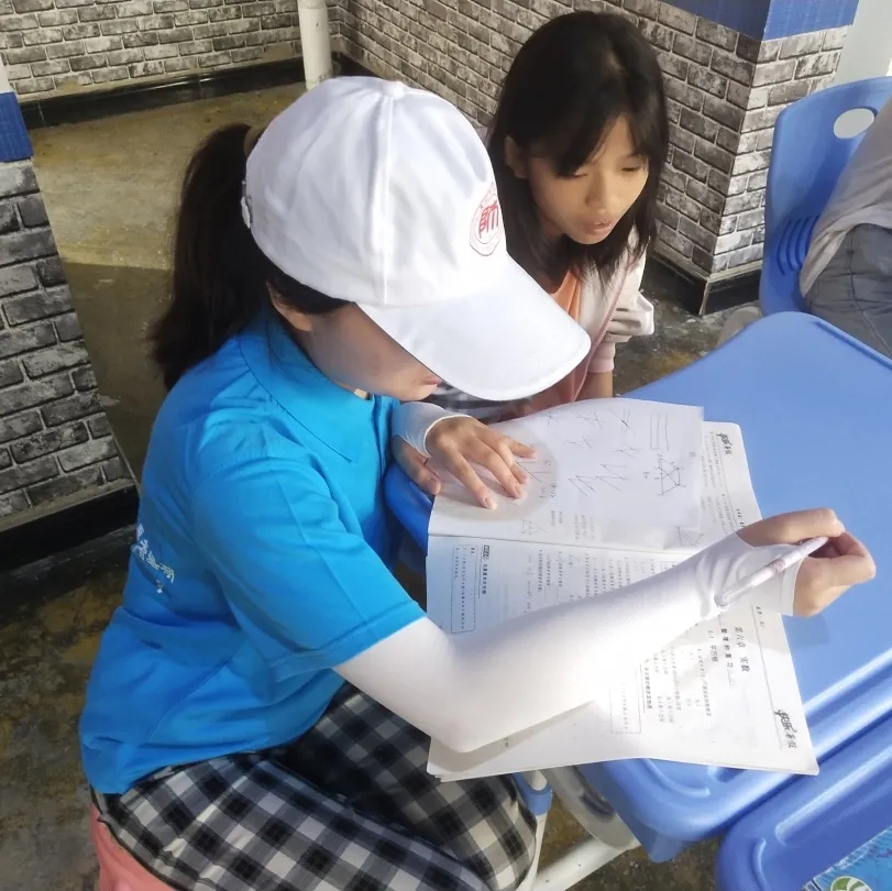 由“三下乡”副队长冉宸睿带领的5名队员,来到了双峰街道“四点半公司”,在这里,各个角落好像都充斥着学习的气息,每个孩子都认真地做着暑期作业,队员们耐心地讲解孩子们遇到的各式各样的难题,就像在后方的“军师”,便是给了孩子最大的心理“靠山”。
