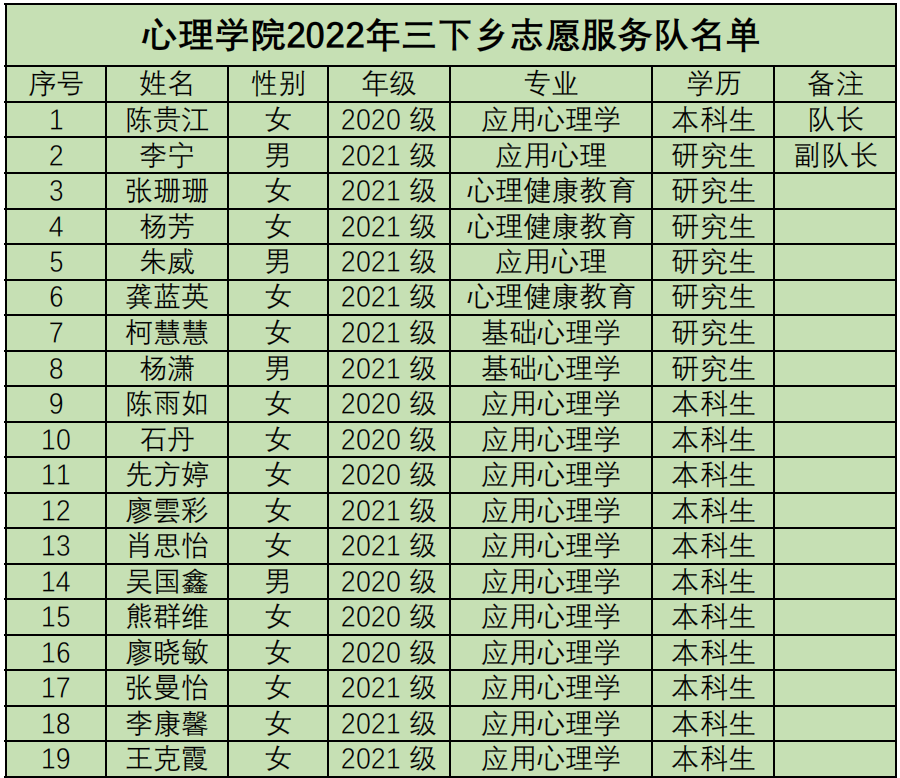 最终有19名志愿者脱颖而出,成为美加墨世界杯官方网站2022年暑期“三下乡”服务队成员。此次美加墨世界杯官方网站“三下乡”服务队由7名研究生和12名本科生组成,并由2020级本科生陈贵江担任队长一职,2021级研究生李宁任副队长。