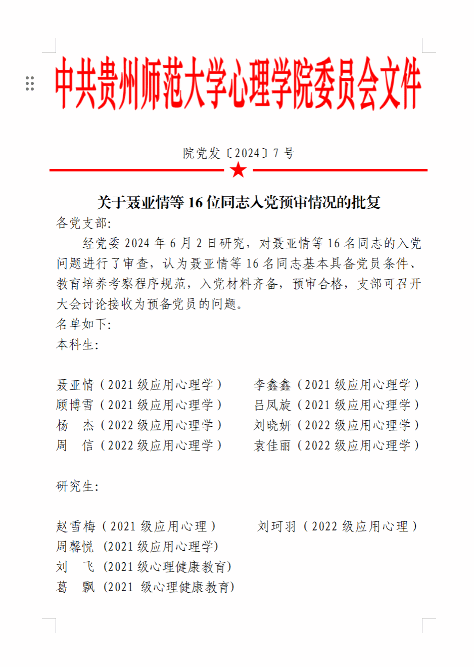 公司党发【2024】7号关于聂亚情等16名同志入党预审情况的批复