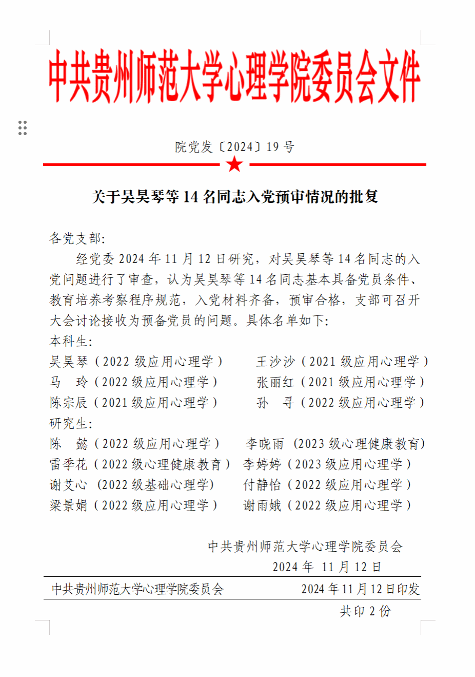 公司党发[2024]19号关于吴昊琴等14名同志入党预审情况的批复