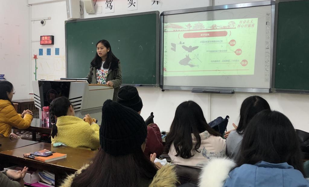 活动伊始,赵可怡以在灯光下用手饰演各种动物的童年游戏展开了此次活动。同学们扮演的狼、鸽子、马等动物寓意着国家的飞速发展,国民生活水平的不断提高,各行各业人员爱岗敬业、恪尽职守。随后,她分别从国家、社会、个人三个层面讲解了“富强、自由、敬业”的具体含义:从国家层面来说,是富强、民主、文明、和谐,它们居于最高层次,对其他层次的价值理念具有统领作用;社会层面中,是自由,平等,公正,法治,它们反映了中国特色社会主义的基本属性,是党矢志不渝、长期实践的核心价值理念;从个人层面来说,是爱国,敬业,诚信,友善,这些都是公民必须恪守的基本道德准则,也是评价公民道德行为准则的基本价值标准。赵可怡还与大家分享了门良杰、张璐、邹勇松三人以建设国家,让国家更加富强、民主,文明为重任而无悔付出的故事。他们为国奉献、创新创业、关爱社会的无私奉献精神感染了在座的每一个人。