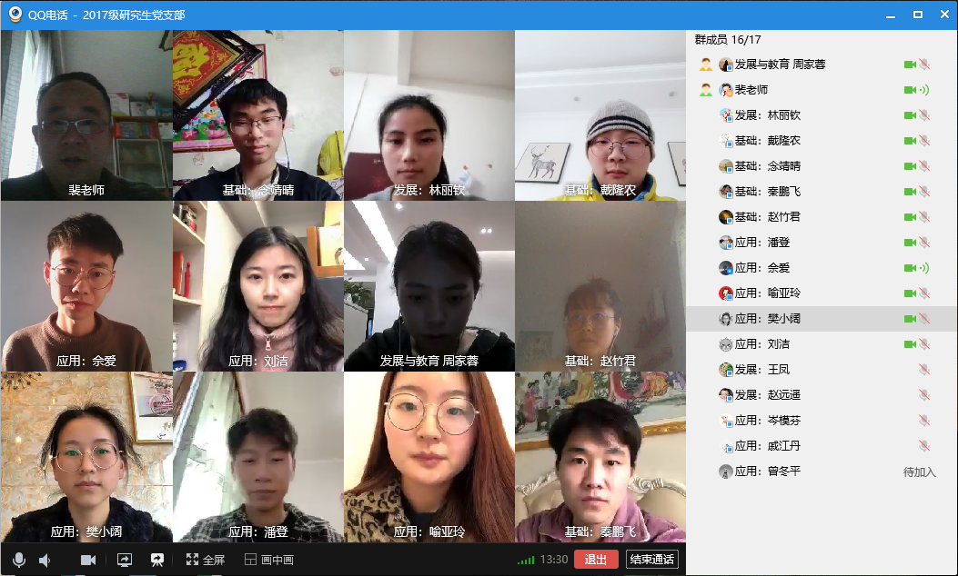 随后,大家围绕本次疫情防控斗争中的先进典型、感人事迹进行分享和学习,并结合近期居家学习生活情况,就个人在疫情期间的所见、所闻、所感轮流开展在线交流。“这次疫情,让我们看到了我国社会主义制度的优越性,感受到了国家对人民生命安全的重视,很庆幸自己身在中国,为自己是中国人而倍感自豪和骄傲。”“疫情发生后,全国各地的医护人员不顾自身安危前往武汉支援,让我们感受到医护人员的伟大,非常感谢医护人员们对这次疫情的付出。”“作为员工党员,利用自己专业特长,编写心理引导方面的书籍,积极贡献着自己的一份力量。”“积极引导家人以及身边的人增强防护意识,站好自己的一班岗,绝不给国家添负担。”……通过交流,支部党员们真挚地表达了对党中央在疫情防控方面各项英明决策的拥护,也表达了对抗疫一线英雄们的敬意,还表达了他们将结合自身专业特长,为祖国和社会积极贡献力量的决心。