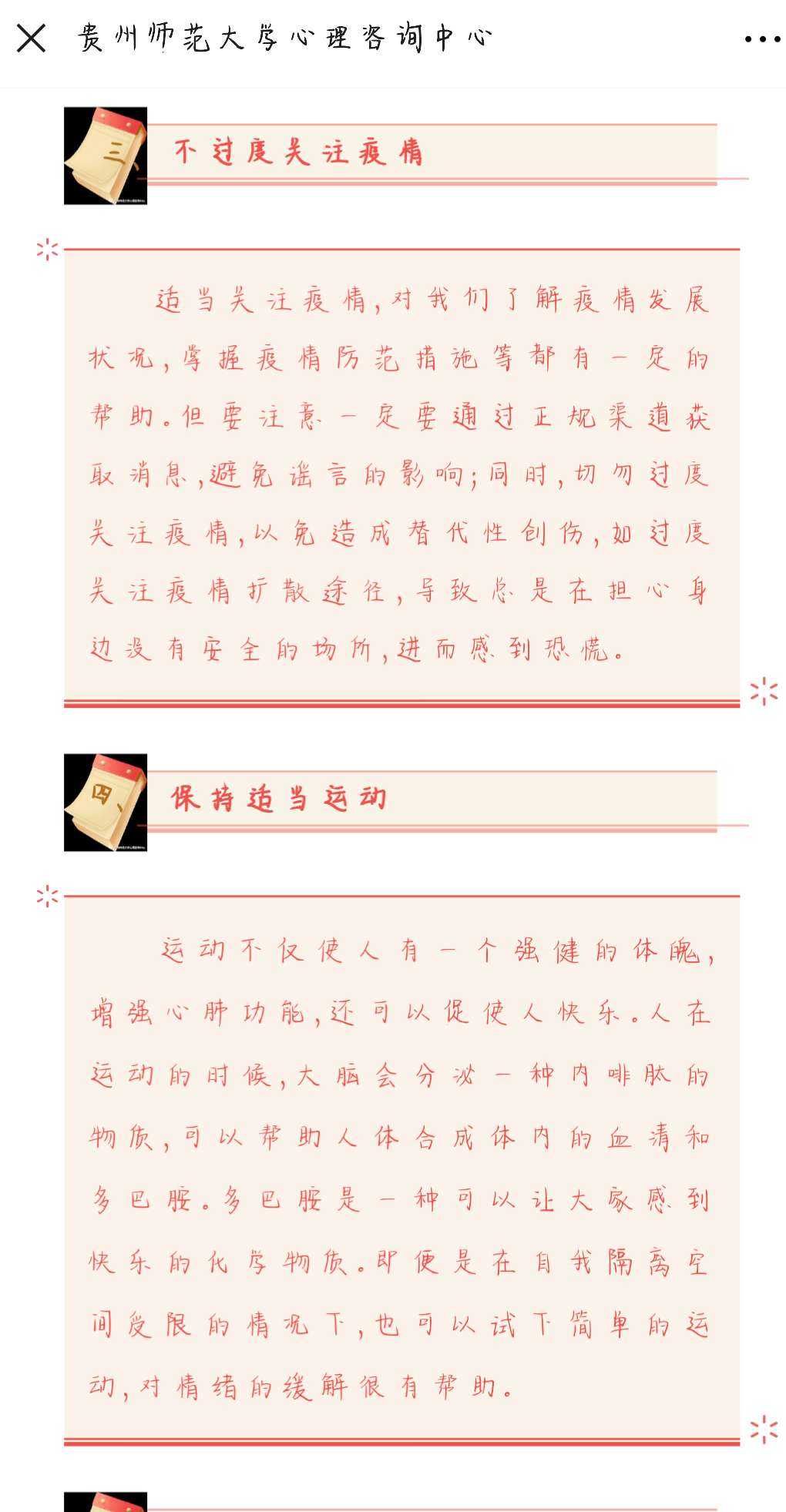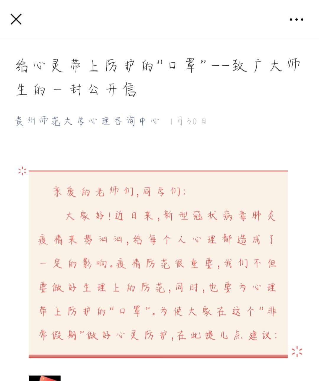 “亲爱的老师们、同学们:大家好!近日来,新型冠状病毒肺炎疫情来势汹汹,给每个人心理都造成了一定影响。疫情防范很重要,我们不但要做好生理上的防范,同时,也要为心理戴上防护的‘口罩’……”这是1月30日,“美加墨世界杯官网心理咨询中心”微信公众号上发布的《给心灵戴上防护的“口罩” ——致广大师生的一封公开信》一文。该篇文章在短时间内迅速获得了5000余次的阅读量,引发师生们的热议。