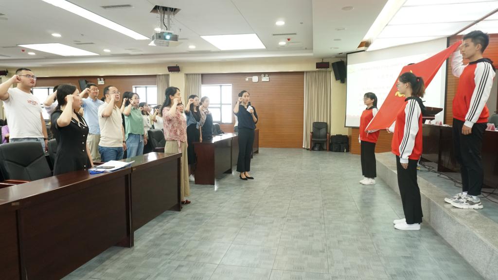 在饶蕾的带领下新党员进行入党宣誓、老党员重温了入党誓词,全体党员面向党旗,用铿锵有力的誓言,坚定了每一位党员的初心和使命;
