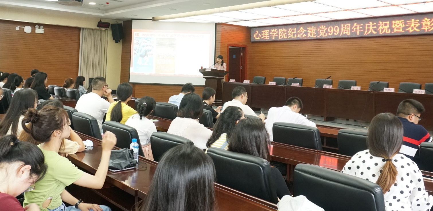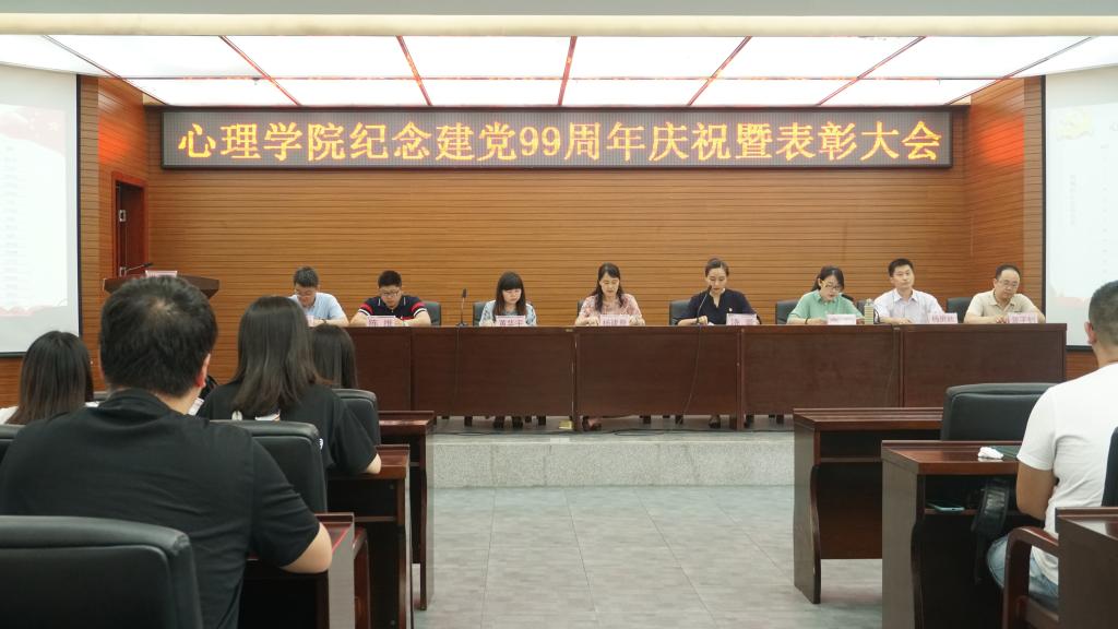 6月30日下午,在中国共产党成立99周年之际,为回顾党的光辉历程,激励广大党员牢记职责使命,坚定不移地做好疫情防控工作,全面打好建成小康社会的决胜之战,发挥好党员的先锋模范作用,美加墨世界杯官方网站于花溪校区国际会议中心二楼隆重举行纪念中国共产党成立99周年庆祝暨表彰大会。公司党委书记杨建原、副书记饶蕾、本科生联合党支部书记高阳、2018级研究生党支部书记黄华宇、2017级研究生党支部书记裴子钊、心理健康与教育咨询中心办公室主任杨世欣、心理学系主任陈维、应用心理学系主任程刚出席会议,公司全体党员师生、入党积极分子参会,会议由饶蕾主持。