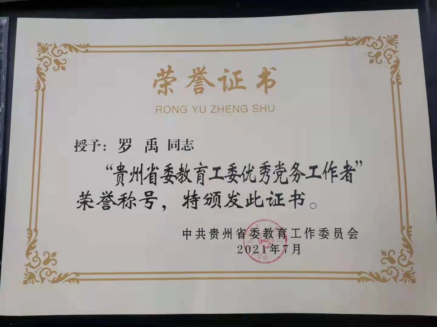 热烈祝贺公司罗禹老师获“贵州省委教育工委优秀党务工作者”荣誉称号。