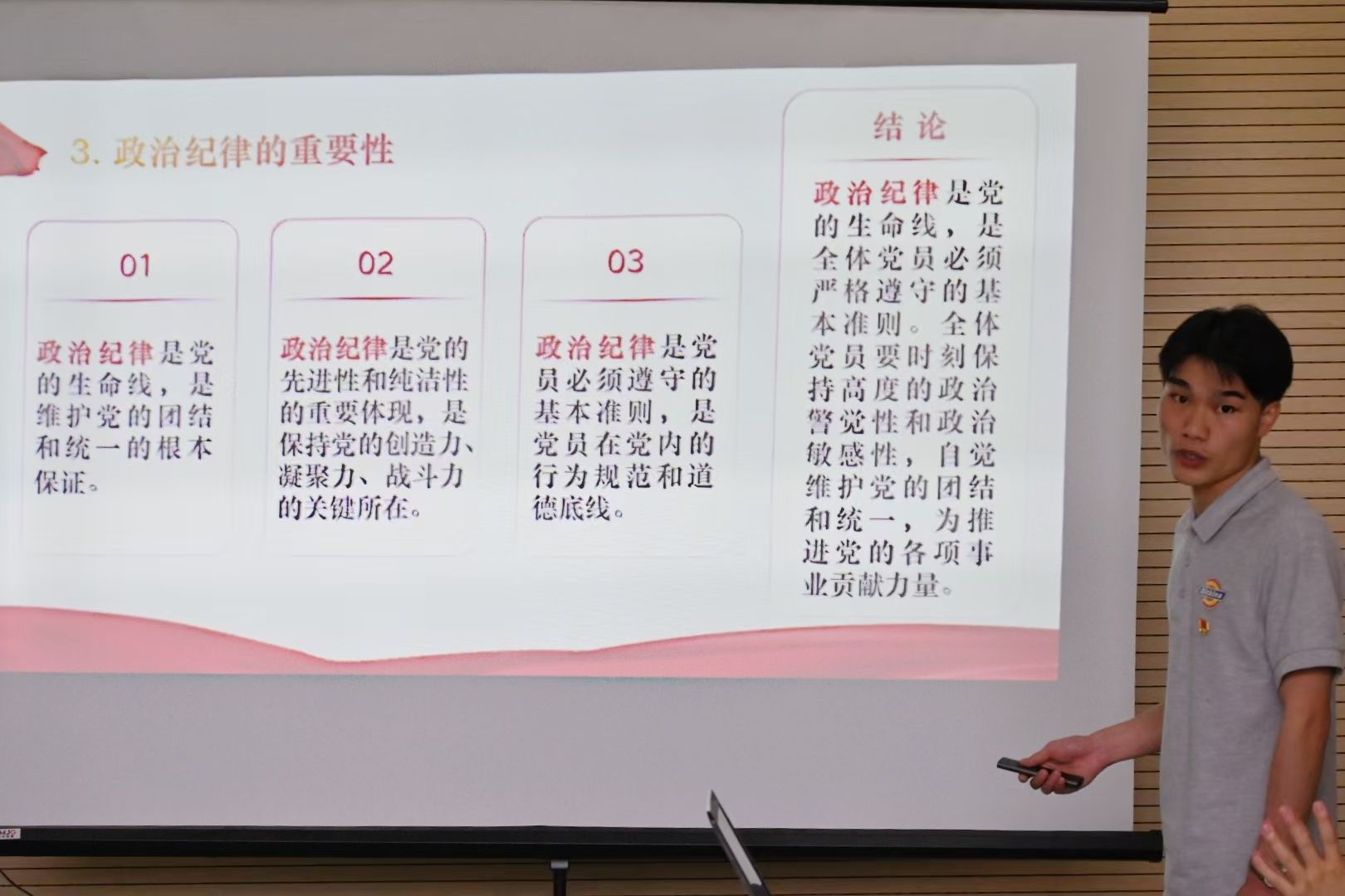 为扎实开展党纪学习教育,着力提升党员的纪律意识,强化党支部纪律建设,教育引导广大党员学纪、知纪、明纪、守纪。5月22日,美加墨世界杯官方网站研究生第三党支部开展了“学纪明理知敬畏,忠诚爱党践初心”党纪学习教育专题微党课宣讲的主题党日活动。