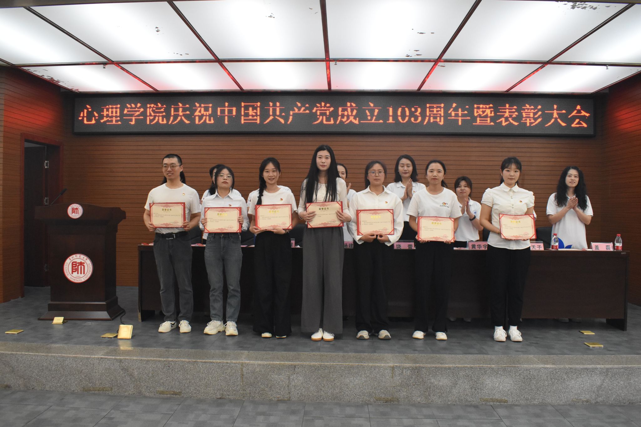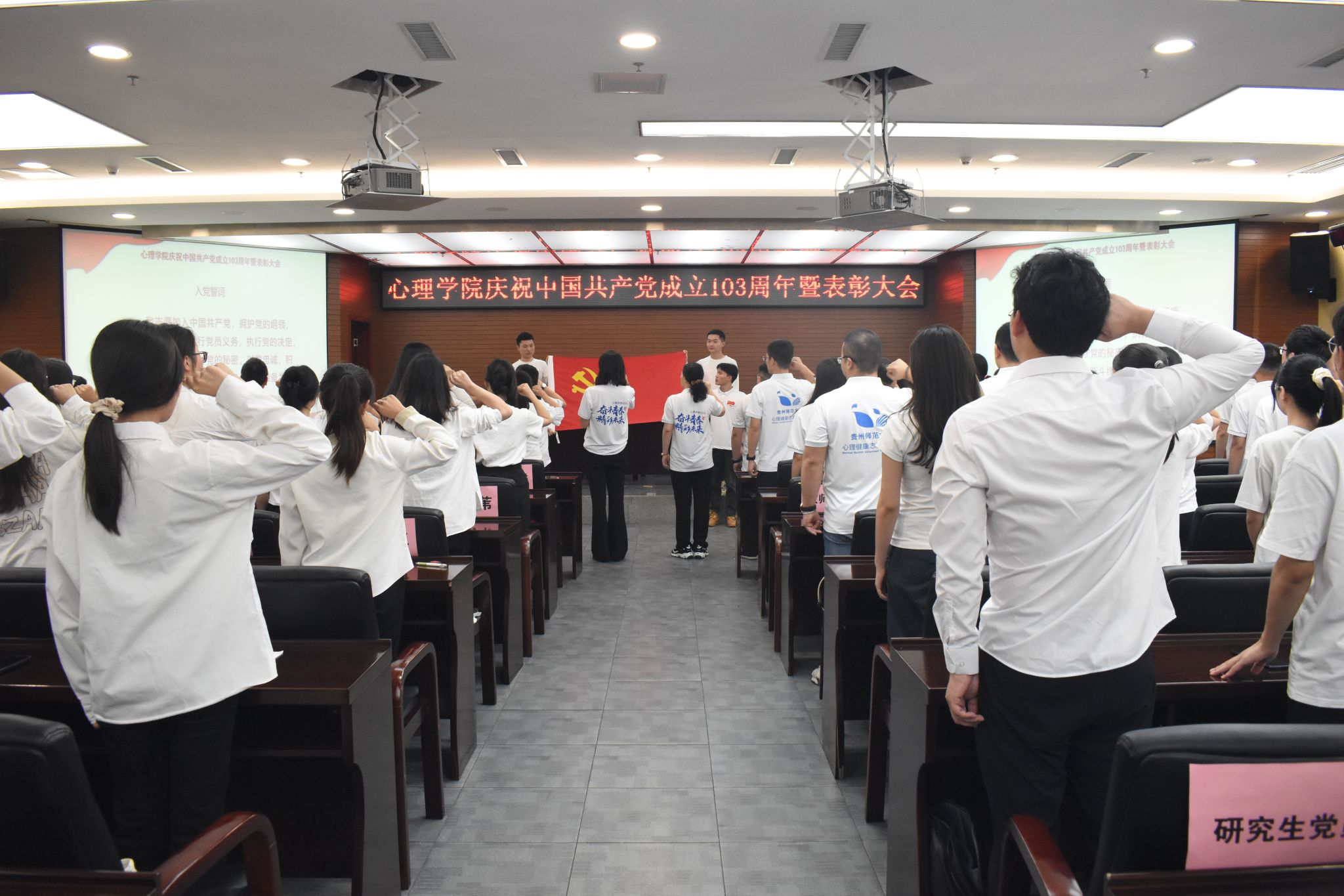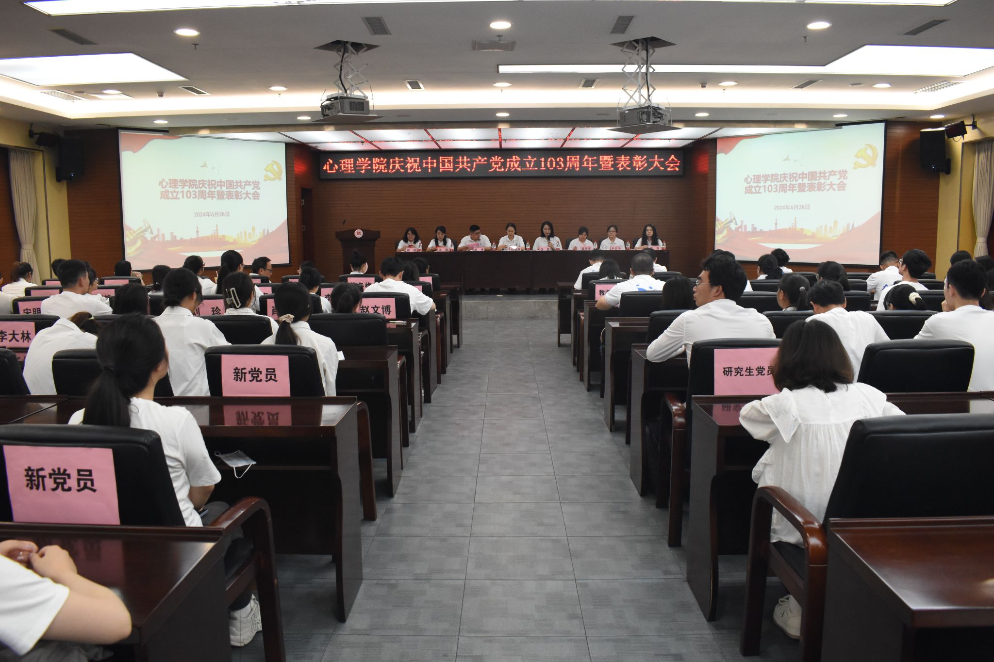6月28日,美加墨世界杯官方网站于花溪校区会议中心二楼报告厅成功召开庆祝中国共产党成立103周年暨表彰大会。公司党委正处级组织员杨建原,党委副书记饶蕾,副经理陈维,党委委员、组织员黄华宇,团委书记高阳,教学管理科科长盖磊,心理学系副系主任、教工第一党支部书记尹天子,研究生第四党支部书记周瑗出席大会。公司全体师生党员、部分入党积极分子以及非党员师生代表参会,大会由饶蕾主持。