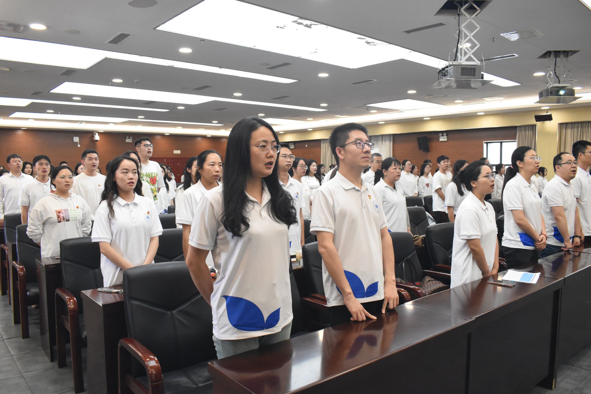 饶蕾带领全体新党员进行入党宣誓,老党员重温入党誓词。