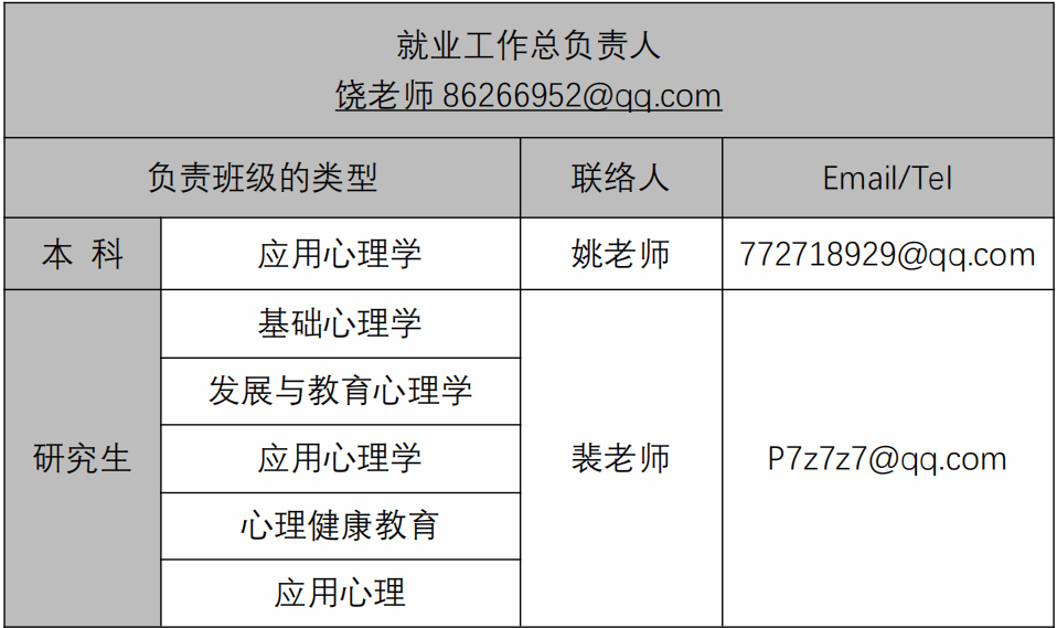2024年美加墨世界杯官方网站有本科毕业生70人,研究生毕业生98人,他们有着扎实的知识功底,过硬的教学能力,希望投入到心理健康教育事业及其他社会需要的岗位中。我们诚邀广大用人单位和员工们与我们联系,为心理学毕业生提供施展才华的工作岗位和奉献社会的难得机会。