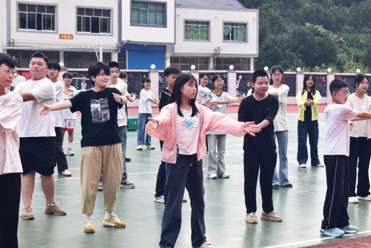 上午,服务队全体队员为本庄中学的同学们策划了一场别开生面的心理减压团辅活动。在活动开始之前,领操的队员以简易韵律操教学欢乐开场,在动感的音乐中,将动作拆解为伸展、摆臂、踏步等简单步骤,反复示范指导。同学们从拘谨到放开,跟着节拍挥臂跳跃,笑容洋溢,现场气氛迅速升温。