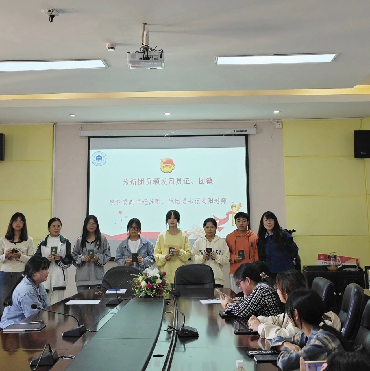 仪式在庄严的国歌声中拉开帷幕。首先,院团委副书记印灵蕴宣读新发展团员名单,其次由高老师为新团员颁发团员证及团徽。随后,举行新团员宣誓、老团员重温入团誓词仪式,全体青年团员面向团旗、右手握拳,在团员代表田梓钰的带领下庄严宣誓。